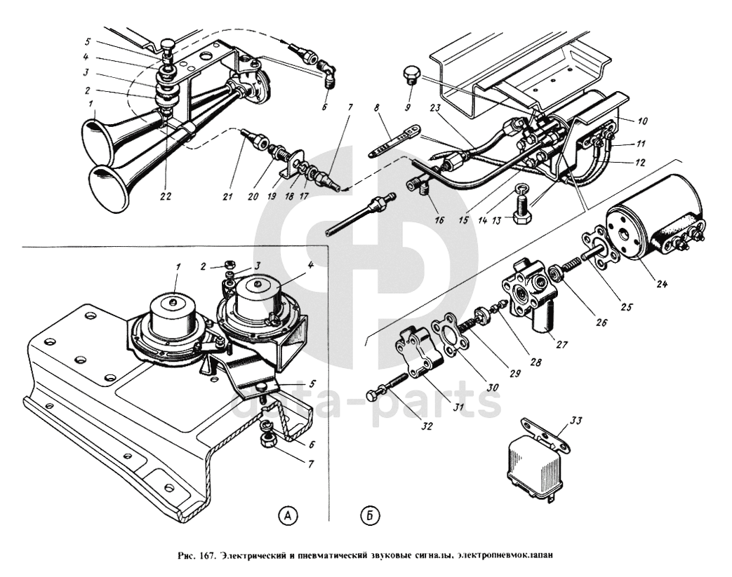 Электрический и пневматический звуковые сигналы, электропневмоклапан