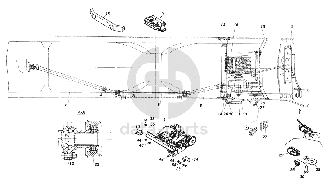 Лебедка с редуктором, поперечиной и тросоукладчиком в сборе