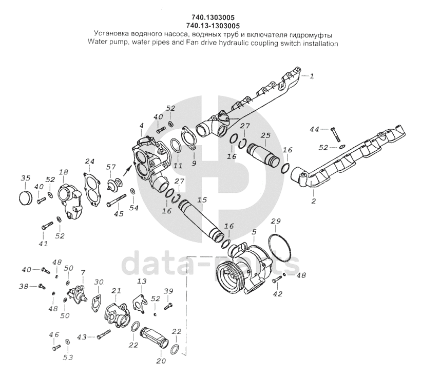Установка водяного насоса, водяных труб и включателя гидромуфты