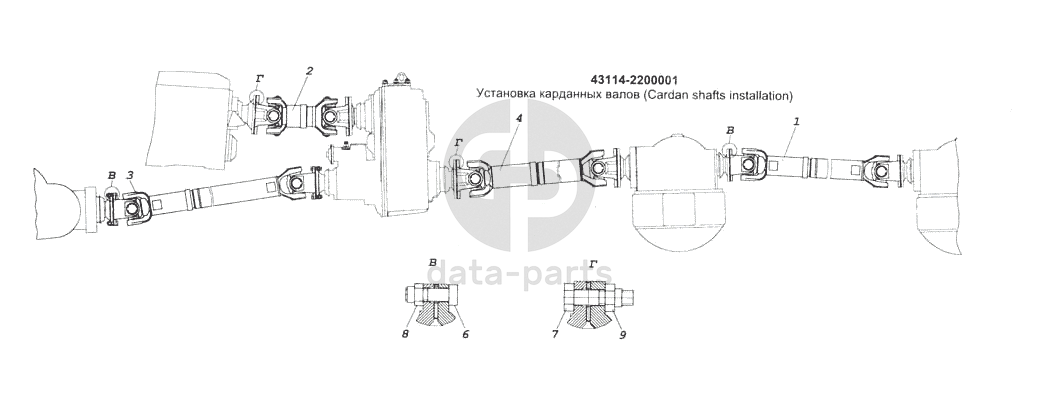 Вал карданный КАМАЗ среднего моста (4 отверстия торцевые шлицы) L=699мм