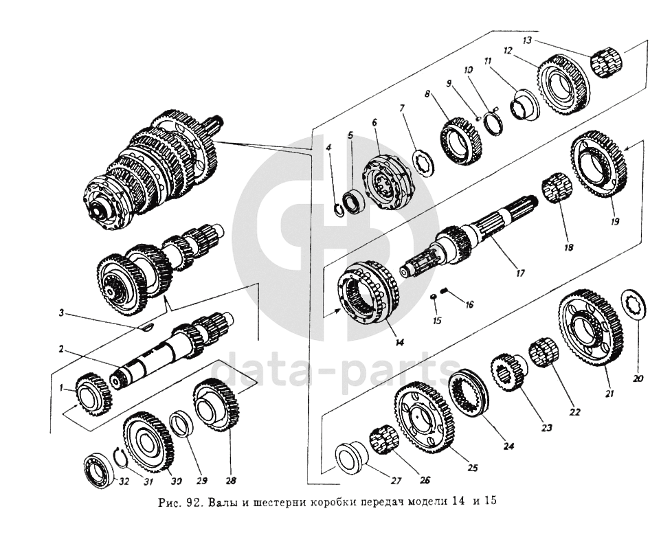 Валы и шестерни коробки передач модели 14 и 15