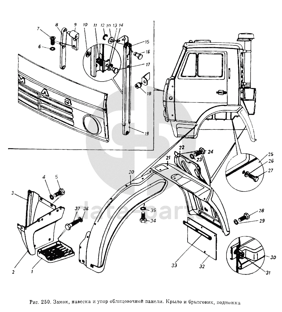 Замок, навеска и упор облицовочной панели. Крыло и брызговик, подножка