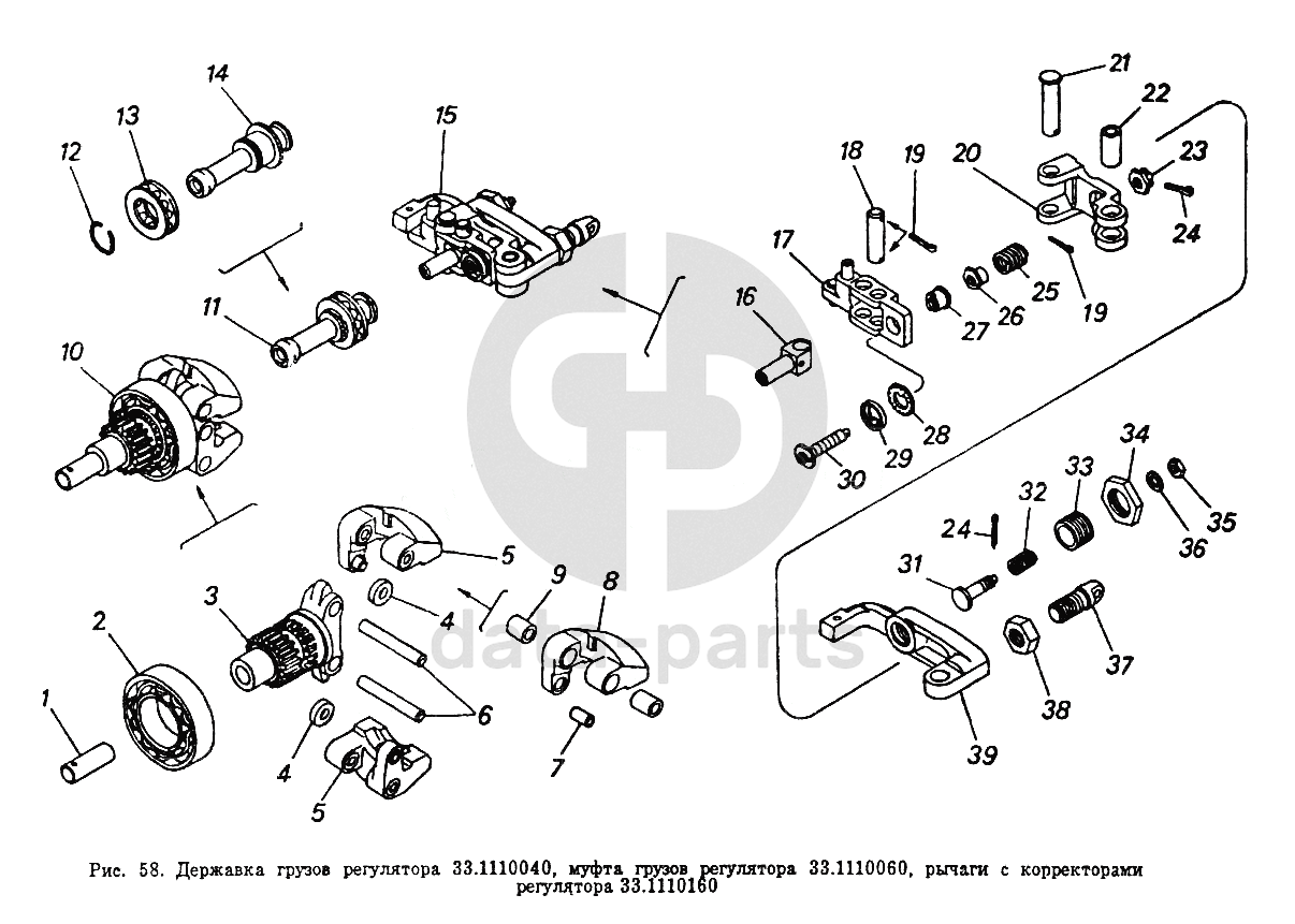 Державка грузов регулятора, муфта грузов регулятора, рычаги с корректорами регулятора