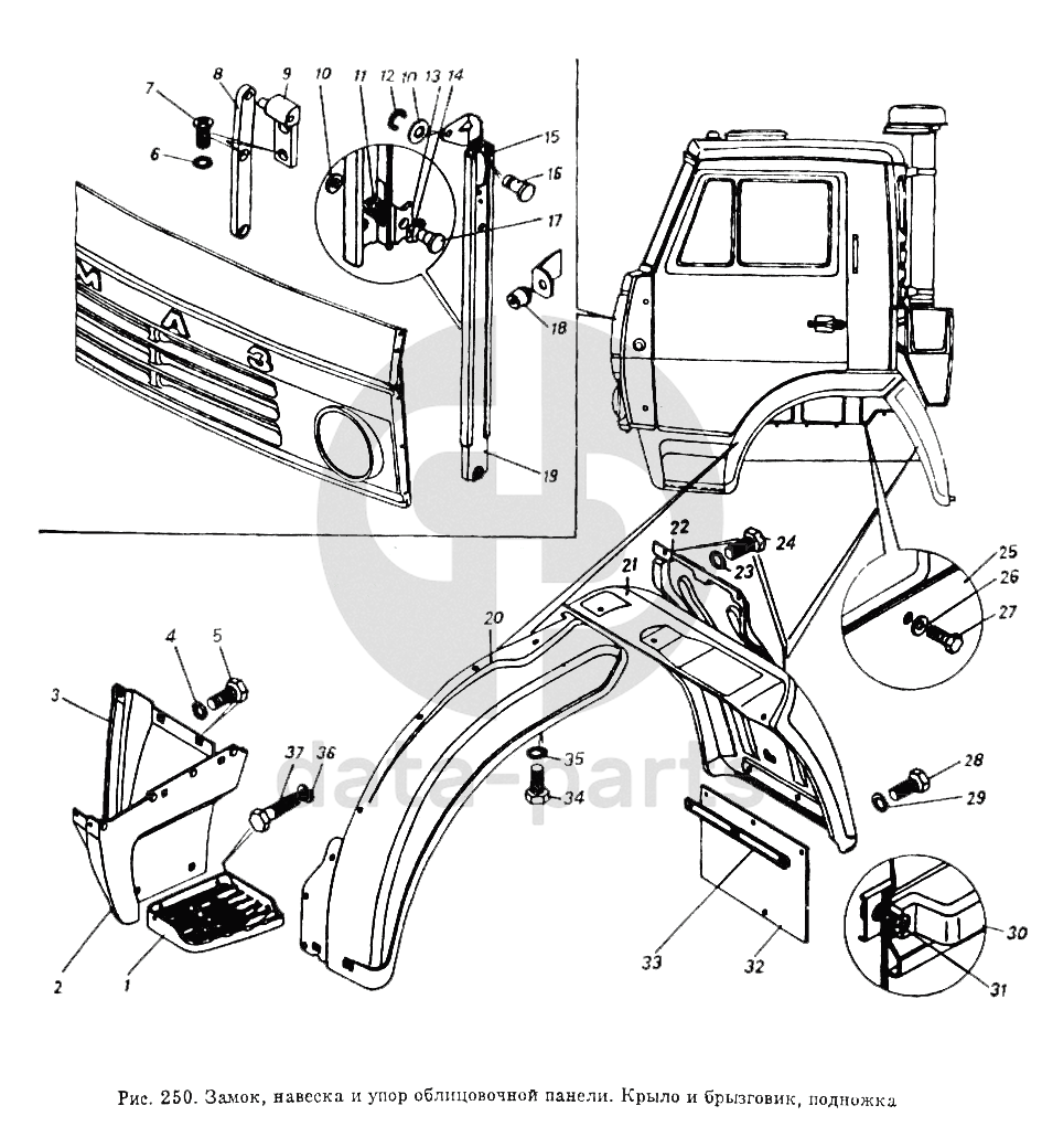 Замок, навеска и упор облицовочной панели. Крыло и брызговик, подножка